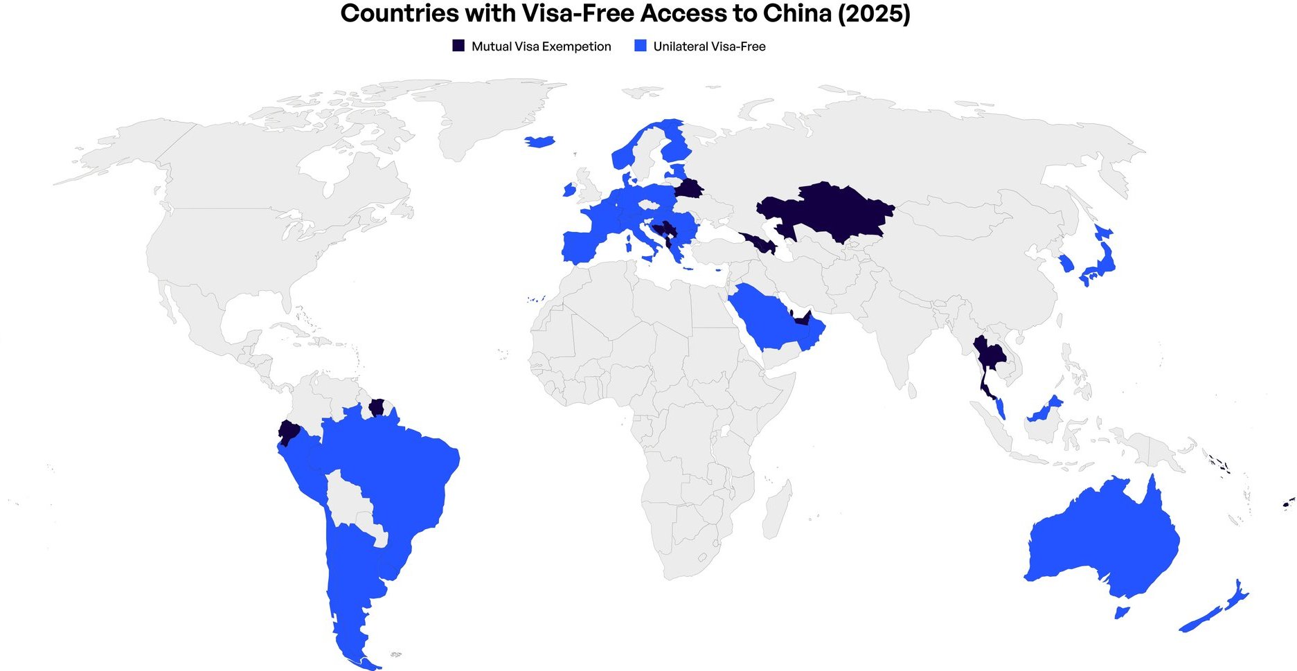 China has also signed several mutual visa exemption agreements, allowing ordinary passport holders from certain countries to enjoy reciprocal visa-free access for stays of up to 30 days per visit, or 90 days within 180 days, for tourism, business, or family visits. In parallel, it has introduced unilateral visa-free policies for select countries, enabling short-term visits without reciprocity.